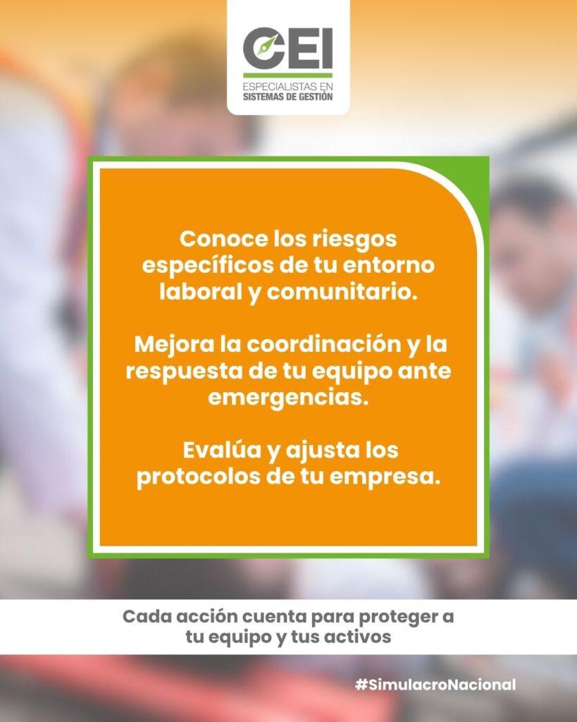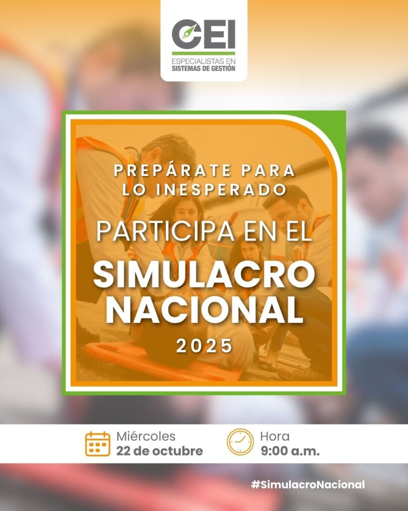 No esperes al último minuto para preparar a tu equipo. 📞 Contáctanos al (+57) 310 679 7773 y asegura una participación efectiva en el Simulacro Nacional de Prevención de Riesgos 2025.